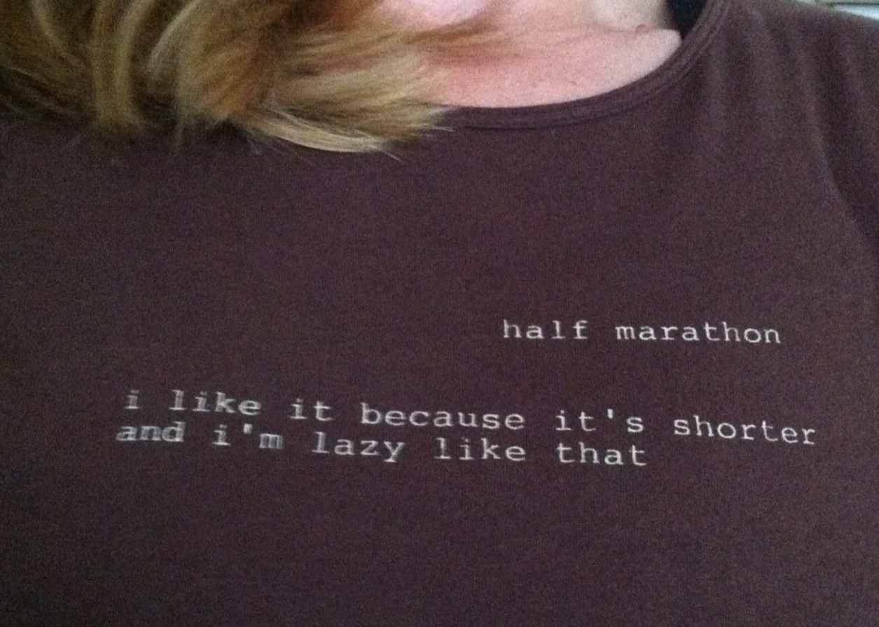 I’ll be the first to admit, when it comes to fitness, I am lazy. I need a motivator, like a trip or an event to get in shape. I love to run, but the motivation isn’t there for me to completely push myself. Sure, I want to PR every race, because it shows that I’m getting better, but some goals in my mind are unattainable right now. I still haven’t conquered the “mind over matter” thing with every aspect to running. Like right now, I see no way how I can complete a full marathon, a triathlon or even a duathlon (nor do I have any plans to sign up for one any time soon). I even have this shirt that proves how lazy I am……